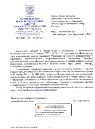 ЧОУ ДПО " Учебно-производственный центр "Резерв" имеет бессрочную лицензию № 11231 серия 74Л02 от "18" декабря 2014г. на ведение образовательной деятельности.
