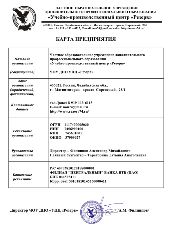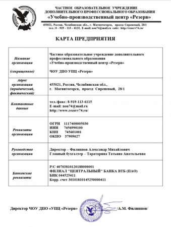 Со всеми реквизитами можно ознакомиться в карте предприятия ЧОУ ДПО "УПЦ "Резерв"